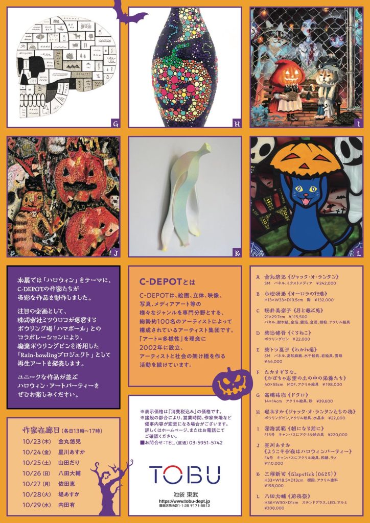 本展では「ハロウィン」をテーマに、C-DEPOTの作家たちが多彩な作品を制作しました。注目の企画として、株式会社ミツウロコが運営するボウリング場「ハマボール」とのコラボレーションにより、廃棄ボウリングピンを活用した『Rain-bowlingプロジェクト』として再生アートを発表します。ユニークな作品が並ぶハロウィン・アートパーティーにぜひご参加ください。