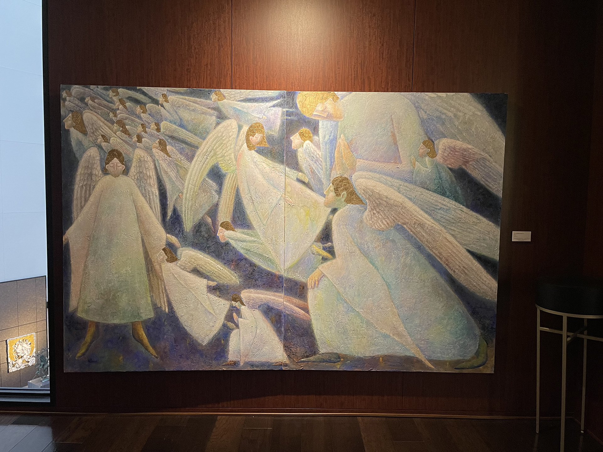 困難の中で対話するように描かれた「天使」は、作者の内面に潜む理想像であり、その表情には全てに対する赦しのような微笑みをたたえています。