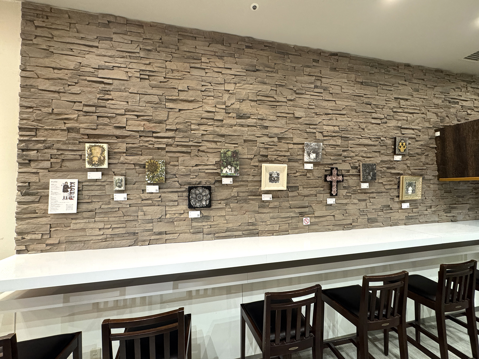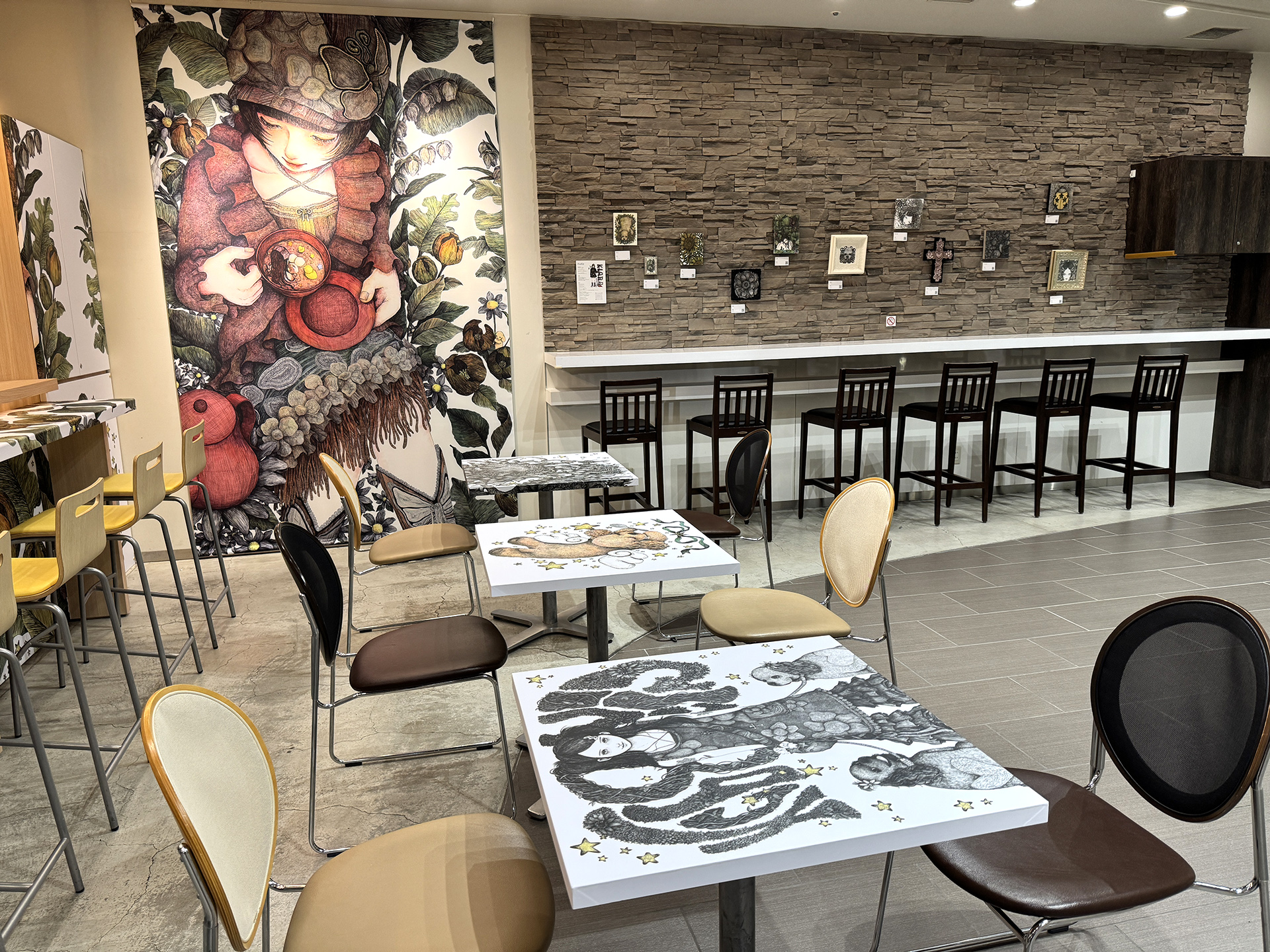 アーティストである喜愛来さん(@__kiarannn__)の緻密なタッチで描かれた独特の世界観を店内各所に配し、原画も展示されています。
